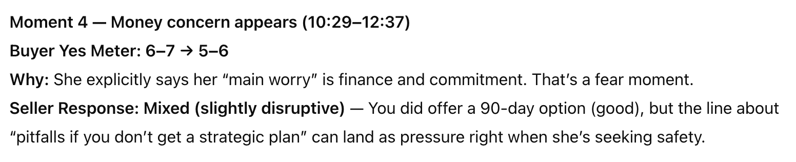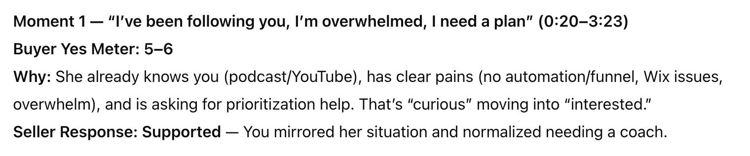 We've seen people make money JUST from the pre-launch email sequence we sent out. 😂 Bill let us know in the chat that he close $1900 just from doing the exercise in the email. And as a sneak peek, I was testing the "Yes Meter" GPT we built for Module 1. We are using AI to help teach/refine/analyze and I've ALREADY learned things about my own sales calls that I never saw. I ran one of my most recent sales calls through this one GPT. I'll show you a moment where it flagged I was supporting the sale and one where I misstepped. Look at how cool this GPT works (it's modeling Module 1 Lesson 3 about using a Yes meter). I uploaded the transcript and it summarized key moments, showing where the buyer was in the journey, and how I either helped or hindered her process at arriving at her own decision. The goal here is to equip you with the education you need (that you can embody) so that we can get those sales instincts working, no matter where the conversation is happening. Easiest Yes! is going to be the course that pays for itself hundreds of times over if you're an online business owner planning to sell in 2026. Doors are open this week only and our pilot run begins in January! xx Julie & Cathy |